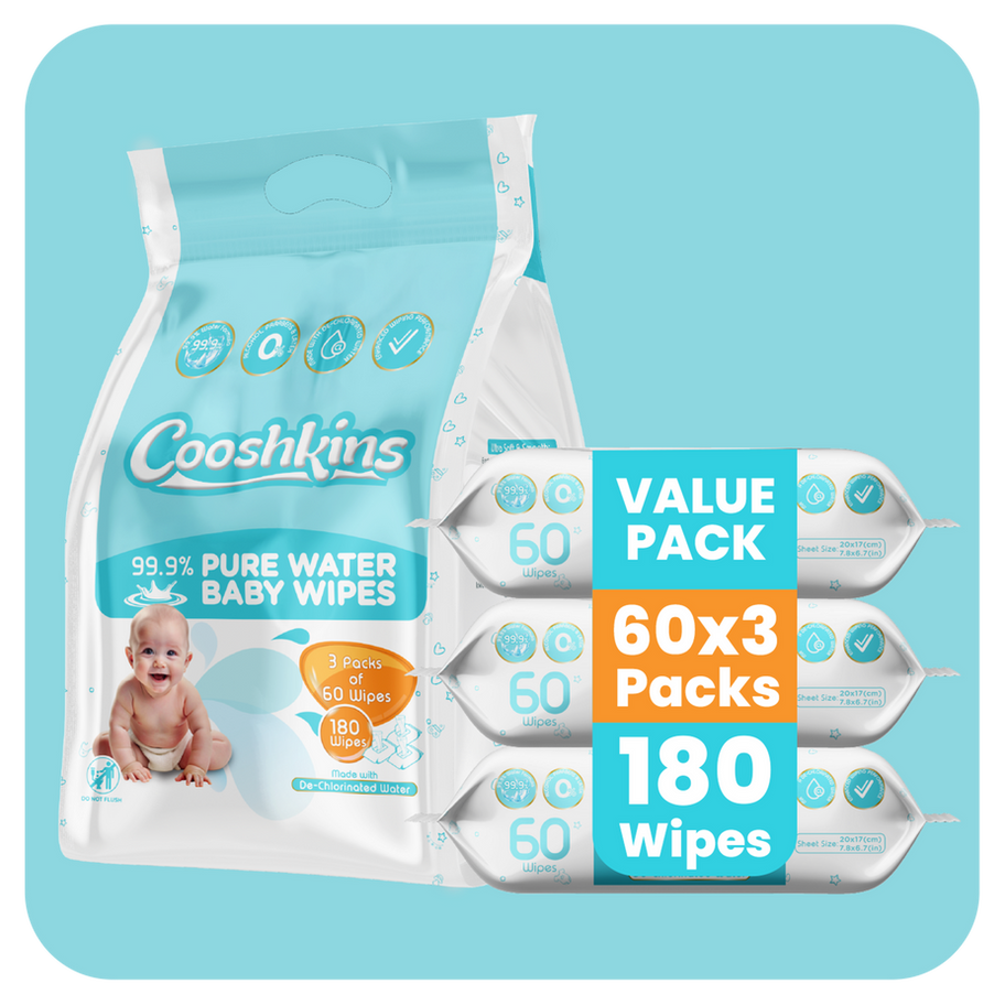 Give your baby the gentlest care with Cooshkins Baby Water Wipes — made with 99% purified water, these wipes are hypoallergenic, unscented, and perfect for sensitive skin. Free from alcohol, parabens, and harmful chemicals, Cooshkins wipes ensure a safe and soothing cleaning experience for your little one — whether it’s for diaper changes, face, or hands. Crafted with ultra-soft, extra-thick material, each wipe is designed to handle messes gently yet effectively, keeping your baby’s delicate skin moisturized and fresh. Cooshkins wipes also feature skin-friendly ingredients that help maintain the natural pH balance, preventing irritation and dryness. Conveniently packed in a resealable 60-count pack, these wipes are ideal for travel, diaper bags, and home use — keeping them fresh and moist till the last wipe. Choose Cooshkins for a pure, gentle, and eco-friendly solution to everyday messes — because your baby deserves only the best.